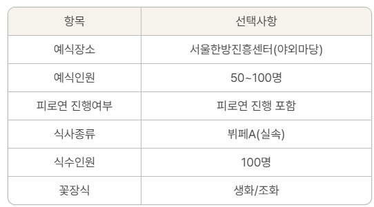 전담업체(그린웨딩,웨딩두잇)과 세부사항 상담 필요 / 예식이 이루어지는 1층 3층의 대관료는 무료 + 피로연 선택시, 피로연 장소(다목적홀) 대관료 360,000원 별도